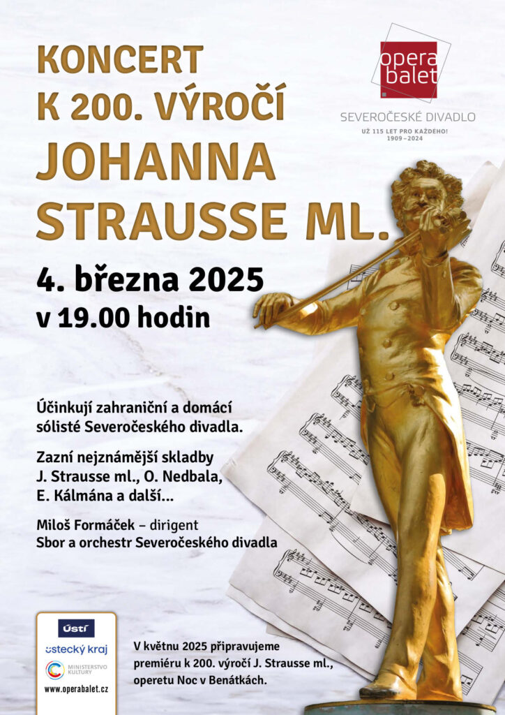 Domácí a zahraniční sólisté operního souboru Severočeského divadla v Ústí nad Labem spojí síly, aby dvousté narozeniny komponisty Johanna Strausse mladšího oslavili uvedením jeho nejznámějších melodií v kontextu tvorby skladatelových následovníků včetně Oskara Nedbala nebo Emmericha Kalmána. Ve vokálních partech vystoupí sólisté opery Jarmila Baxová a Jaroslav Kovacs a také zahraniční členové operního souboru, pěvci Elizabeta Legierski, Daria Guliaeva, Anna Maria von Kada a Kaylee Norris. Sbor a orchestr Severočeského divadla bude řídit Miloš Formáček, který je současně i ředitelem divadla.