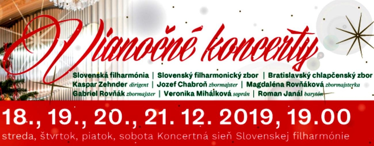 Od středy 18. do soboty 21. prosince vždy od sedmi hodin oslaví Vánoce Slovenská filharmonie. Na čtyřech koncertech zazní pod taktovkou Kaspara Zehndera v provedení Slovenské filharmonie, Slovenského filharmonického sboru a Bratislavského chlapeckého sboru, sopranistky Veroniky Mihálkové a barytonisty Romana Janála slavnostní vánoční program. Tradicionály a koledy doplní latinský hymnus Adeste fideles, Květinový valčík z Čajkovského baletu Louskáček, skladby Hvězda z Betléma a Vánoční kantáta pro sóla, sbor a orchestr Josepha Rheinbergera, Panis angelicus Césara Francka, nebo sborová For the Beauty of the Earth Johna Ruttera.