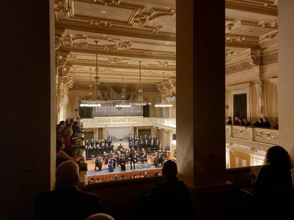 Gloria in Re maggiore, RV 589 Antonia Vivaldiho patří k jeho církevním skladbám. Jde o část mešního ordinária, která se dočkala repertoárového zájmu až v minulém století. Jde o skladbu pro komorní orchestr, sbor, varhany a dva soprány. Dvanáct částí ordinária je poměrně krátkých, radostné úvodní sborové Gloria následuje sborové Et in terra pax, aby je vystřídaly dva sólové soprány podpořené orchestrem. Andrea Ľuptáková z Banské Bystrice, naturalizovaná v Brně, předvedla jasný, poněkud ostrý soprán, vítězně se nesoucí sálem. Lucie Vorlová přešla z řad sborových dopředu mezi sóla a přednesla suverénně part druhého sopránu měkkým hlasem. Gratias agimus tibi je sborová svižná fuga, sborové Propter magnam gloriam doplnilo jímavé hobojové sólo. Domine Deus je pro sólový soprán, který se opět ostře odrážel od stěn Besedního domu. Domine, fili unigenite je svižné sborové fugato, následuje Domine Deus, Agnus Dei, uvozené violoncellovým krásně znějícím vstupem Lukáše Poláka, barevně korespondujícím s měkkým altovým projevem Marie Vrbové, podkresleným varhanami Martina Jakubíčka. Sborové Qui tollis peccata mundi vystřídala část Qui sedes ad dexteram Patris, které naplnila Marie Vrbová měkkým a znělým altem a procítěným projevem. Quoniam tu solus sanctus byla příležitostí pro sbor, jak se blýsknout technicky zvládnutou svižnou fugou, a závěr patřil opět sboru, který představil nejprve hutné basy, pak soprány, alty a tenory, které se následně proplétaly v monumentálním zvuku.