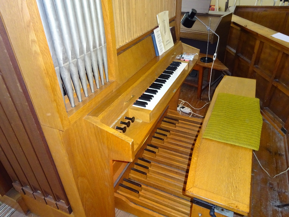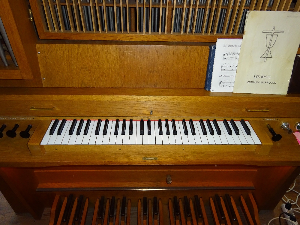 Manuálová klaviatura má velké klávesy bílé, půltónové černé, pedálnici paralelní (má podobnou barevnost jako manuál). Manuálové rejstříky se ovládají pomocí manubrií nalevo od manuálové klaviatury, jeden pedálový napravo. Pedálová spojka se aktivuje šlapkou na zaháknutí umístěnou na prahem pedálnice.