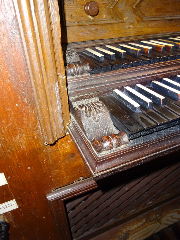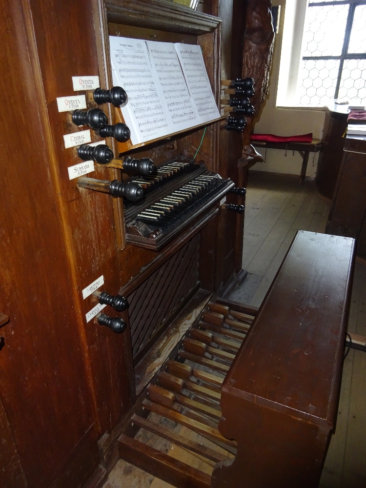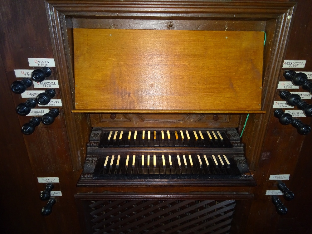 Varhany mají manuálové klaviatury v tzv. inverzní barevnosti ‒ velké klávesy jsou černé a malé bílé, velké oktávy manuálů i pedálu jsou tzv. krátké (tóny manuálu: C, D, E, F, G, A ‒ c3), nicméně v pedálu jsou obsaženy všechny tóny v chromatickém pořadí v rámci velké oktávy, ale na jiných místech (klávesy cis a dis hrají tóny velké oktávy, fis a gis taktéž ‒ konkrétní uspořádání pedálových kláves zleva doprava: C, F, D, G, E, A, Hes, c, Cis, d, Dis, e, f, Fis, g, Gis, a. [Tučné písmo označuje půltónové klávesy.])