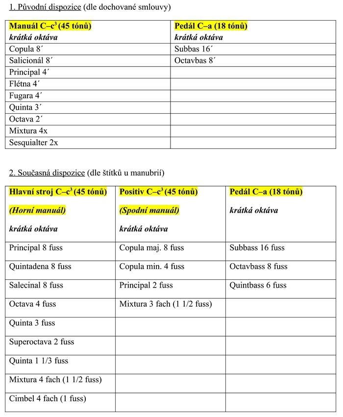 „Dle smlouvy se jednalo o jednomanuálový nástroj s pedálem a jedenácti rejstříky naladěný v tzv. kornetovém ladění.“