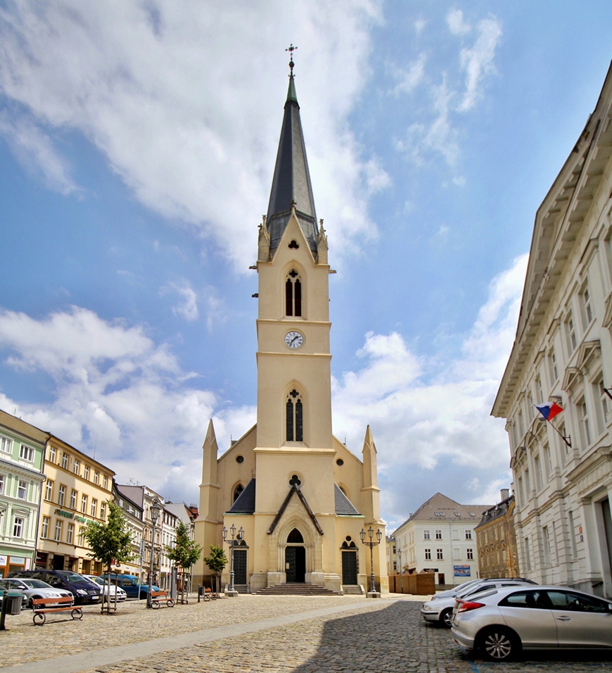 První zprávy o zdejších varhanách jsou z roku 1619, kdy měl varhanář David Däcker postavit nový nástroj. Tyto varhany měly dle smlouvy i zadní pozitiv. Nešlo tedy na svoji dobu o nijak malé varhánky. Během třicetileté války byly poškozeny, ale Georg Weindt je opravil a fungovaly do roku 1731, kdy byly nahrazeny novým nástrojem. Nepřestaly však tehdy zcela existovat. Byly částečně využity na stavbu menšího nástroje do kostela sv. Kříže – o něm dále níže. Nové varhany do hlavního kostela stavěl snad Johann Jakub Josef Richter. Jeho autorství není jisté, ale předpokládá se, neboť šlo o místního varhanáře. Známá jsou jména varhanářů, kteří nástroj v průběhu let opravovali – Bedřich (Friedrich) Semrád a Josef Gartner (třetí toho jména). V roce 1845 byl nástroj rozšířen a dostal novou skříň. Práci provedl Friedrich Christian Reiß. V osmdesátých letech devatenáctého století byla dispozice obohacena mimo jiné o trompetu v hlavním stroji a pozoun v pedále. Celkový počet rejstříků tehdy dosáhl třiceti dvou. Na rozšiřování se podíleli varhanáři Chwatal, Schuster a Salomon (také jako „Salamon“).