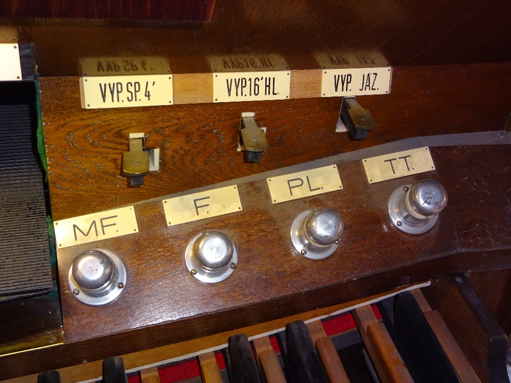 Vypínač spojek 8´, Vypínač spojek 16´, Vypínač spojek 4´, Vypínač hlasů 16´, Vypínač jazykových hlasů, Vypínač crescendového válce, Volné kombinace A, B, C; Pevné kombinace MF, F, PL, TT