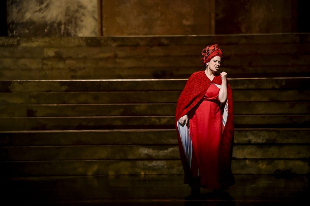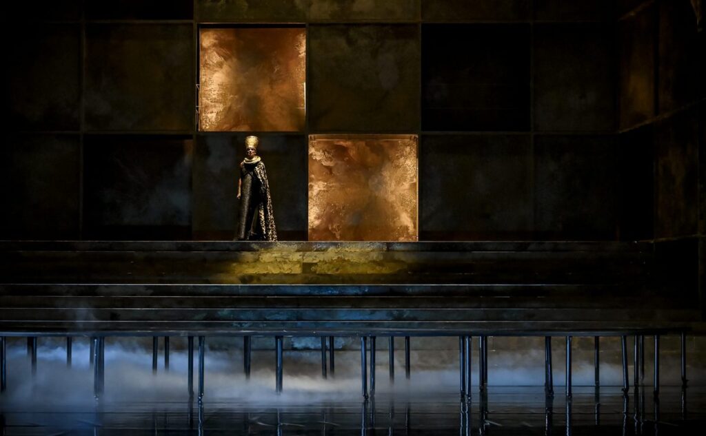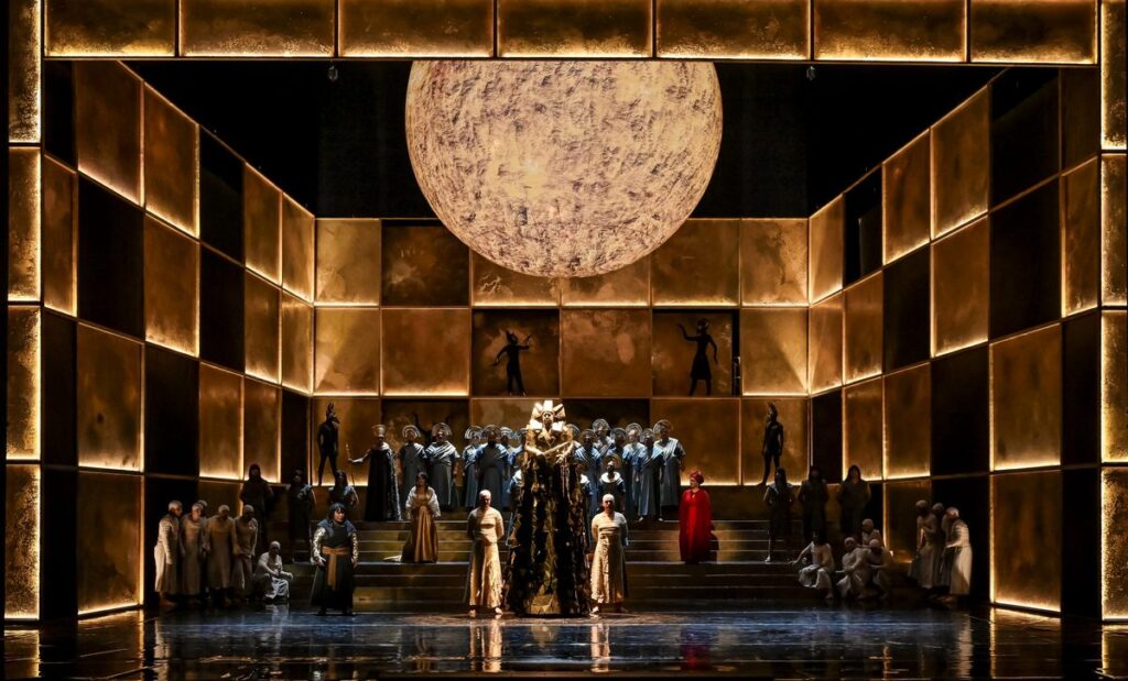 Za výtvarnou podobou inscenace, která měla premiéru 26. září, stojí scénograf Marek Cpín, kostymérka Linda Boráros a světelný designér Přemysl Janda. Scéna silně a zdařile evokuje starověký Egypt. Bohatě zlatými deskami na stěnách, černozlatými kostýmy, poměrně věrnou vizuální stylizací tanečnic do podoby, kterou máme všichni spojenou s malovanými reliéfy v hrobkách a chrámech, s obrázky řazenými do pásů… Aidu zkomponoval Verdi na objednávku pro nové operní divadlo v Káhiře, slavnostně otevřené u příležitosti zahájení provozu v Suezském průplavu. Premiéra se tam sice nakonec konala až později, 24. prosince 1871, ale Aida s českou sopranistkou Teresou Stolzovou v titulní roli se po milánské premiéře, uskutečněné 8. února 1872 v divadle La Scala, stala dílem oceňovaným i v Evropě.