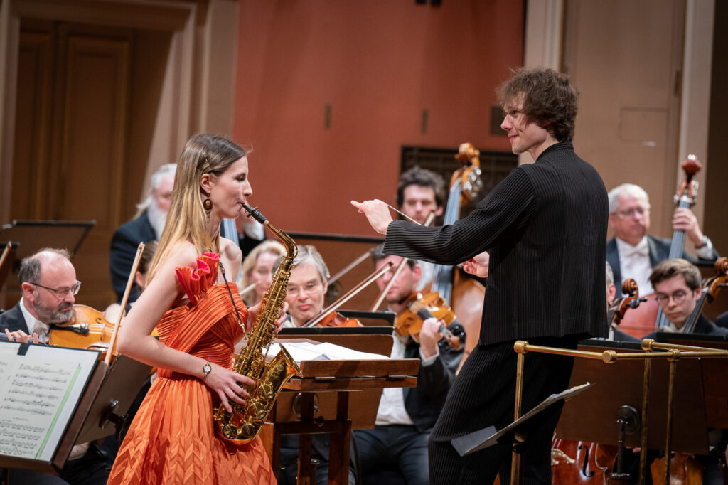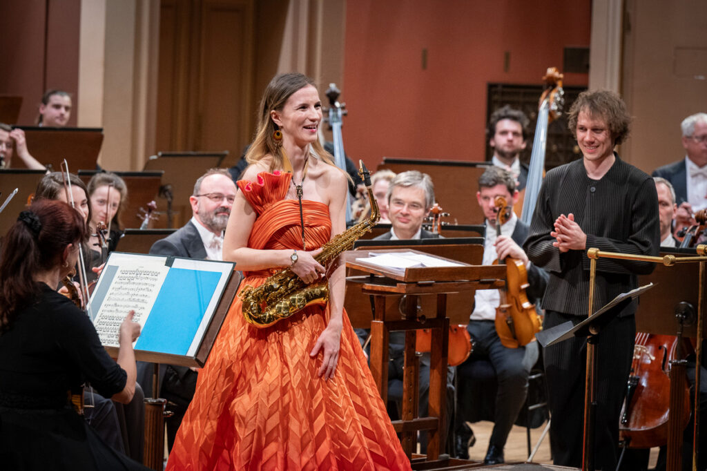 Pro následují dvě skladby programu přivedl pak na podium sólistku. Zlatý saxofon v rukou Valentine Michaud se skvěl na pozadí její plesové róby jako vycizelovaný šperk mistrného klenotníka. S fantazijním vizuálním zjevem se ruku v ruce skvěla její parádní hra sytého a barevného tónu v hlubších polohách i bezpečná výdrž v horním rejstříku nástroje. Samozřejmá virtuozita v technicky vypjatých pasážích naplnila obě skladby atraktivním umem. První z nich, Balada pro altový saxofon, smyčcový orchestr, klavír a tympány Franka Martina z roku 1938, byla původně psaná pro sólový pozoun s klavírem – a ten se v úpravě pro saxofon a orchestr také výrazně ozývá. Saxofonovou verzi psal Martin pro legendárního Sigurda Raschera, který fascinoval své současníky, a tak vzniklo 208 kompozic, které mu byly věnovány. Psali pro něj i naši modernisté Alois Hába, Otmar Mácha, Karel Reiner a Karel Husa.