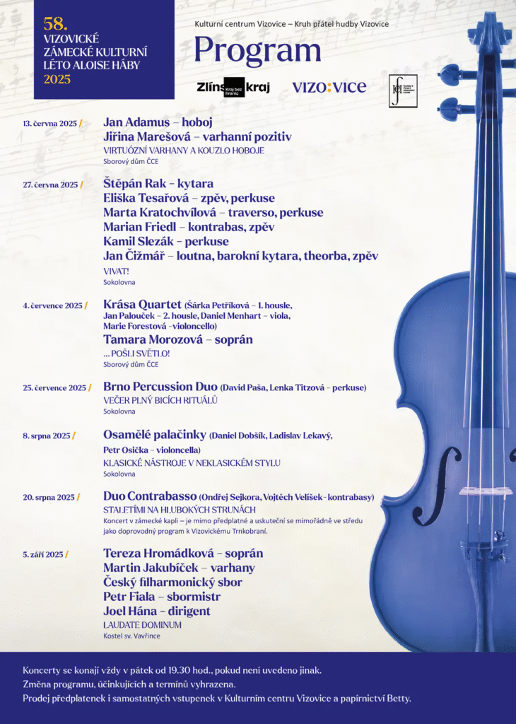 V letošním roce se uskutečňuje už 58. ročník tradičního cyklu komorních koncertů Vizovické zámecké kulturní léto Aloise Háby. Program celého ročníku se děje na různých místech Vizovic, s jednou výjimkou vždy v pátek od půl osmé. Nejbližší koncert nabídne umění smyčcového kvarteta Krása Quartet, spolu s ním 4. července zazpívá Tamara Morozová.