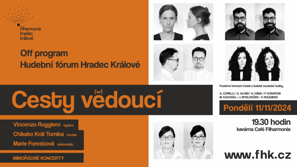 Česko-italský program v Praze a posléze na královehradeckém festivalu Hudební fórum uvede česko-italské trio. Kytarového partu se nejen ve své vlastní kompozici ujme Vincenzo Ruggiero, absolvent HAMU ve třídě Václava Trojana, houslový part rozehraje Chikako Král Tomita, působící také jako zástupkyně koncertního mistra Filharmonie Hradec Králové. Na violoncello vystoupí Marie Forestová, koncertní mistryně violoncell Komorní filharmonie Pardubice a členka Krása Quartet.
