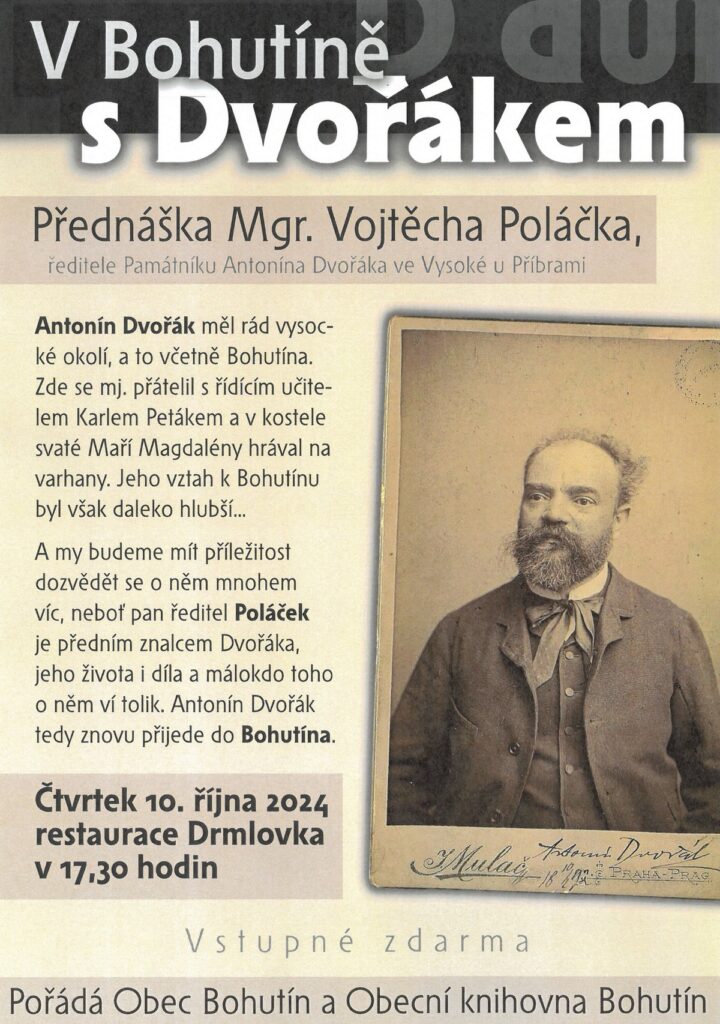 Kniha je nyní k dostání či objednání v Památníku a připravována je také kratší anglická verze. V této souvislosti Památník připravil na čtvrtek 10. října od půl šesté večer v restauraci Drmlovka v Bohutíně přednášku Vojtěcha Poláčka, ředitele Památníku s názvem V Bohutíně s Dvořákem, která se rovněž bude zabývat Dvořákovým vztahem k Vysocku.