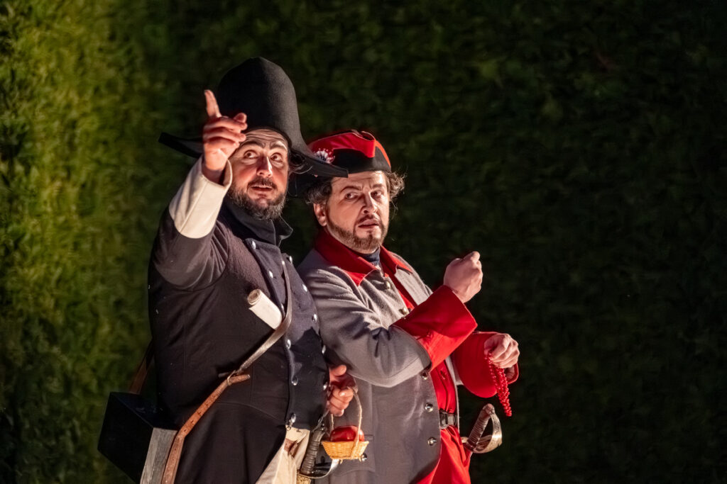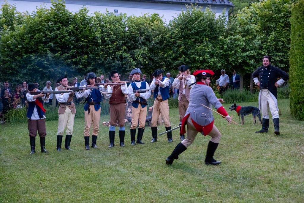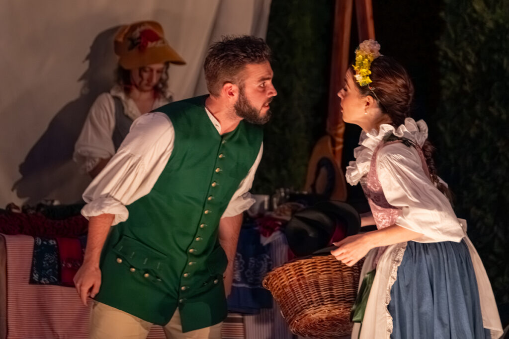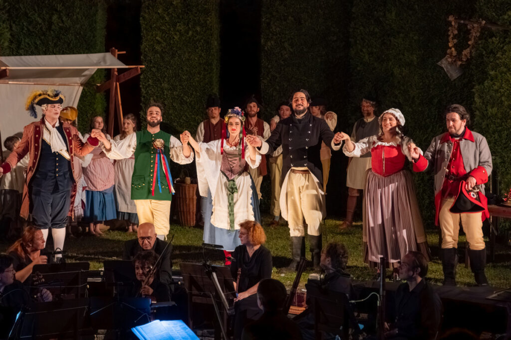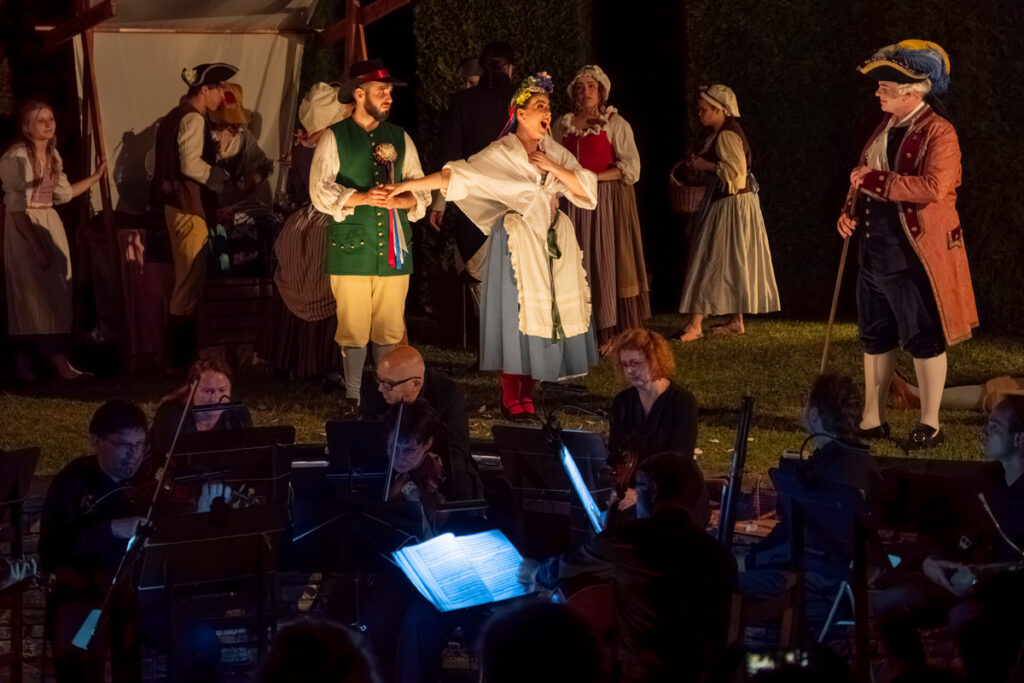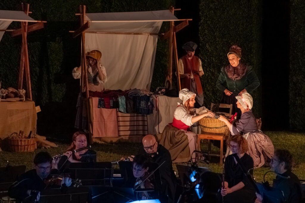 Ke gurmánským požitkům v zahradě vyhrává zámecká kapela alias Musica Florea a hosté jsou zváni k různým šprýmovným produkcím v zahradě, třeba do „vojenského“ tábora, zaplněného interprety Bendovy opery, což má svůj důvod, neboť děj Vesnického jarmarku se točí kolem dobrovolně-nedobrovolného odchodu na vojnu.