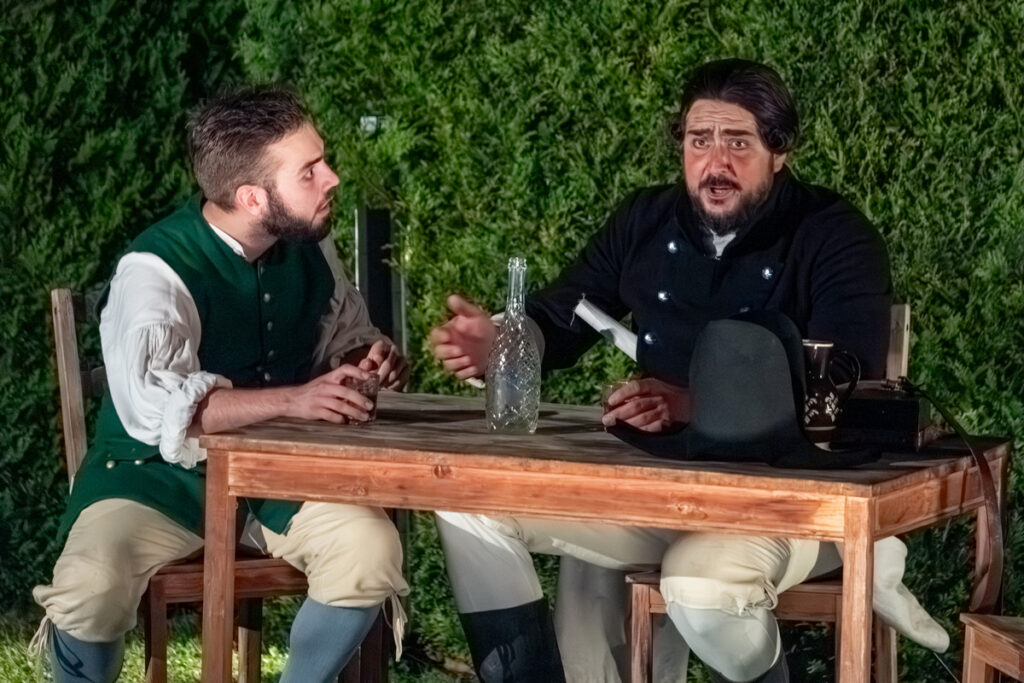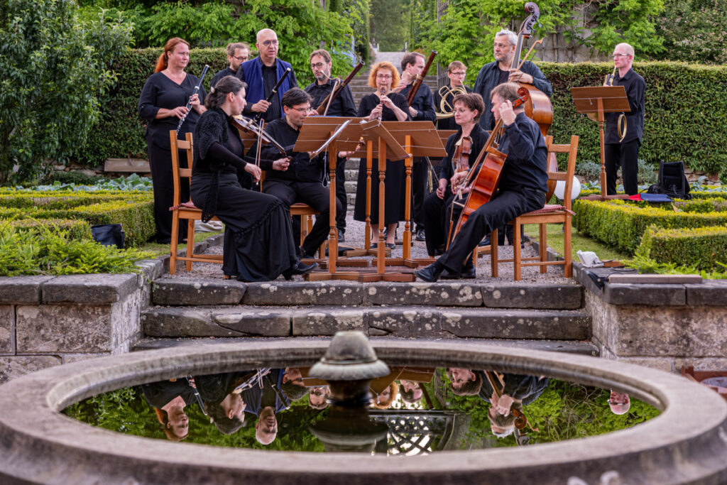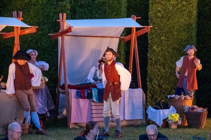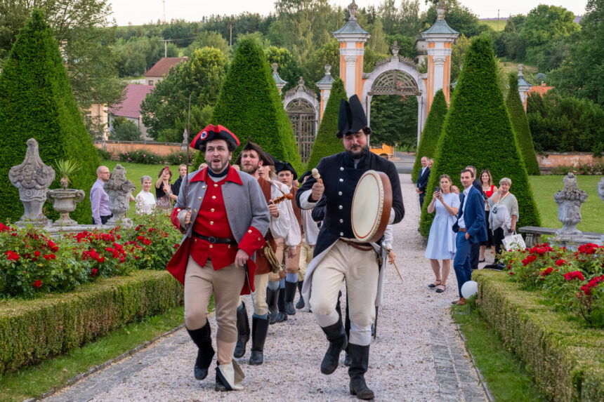 Ke gurmánským požitkům v zahradě vyhrává zámecká kapela alias Musica Florea a hosté jsou zváni k různým šprýmovným produkcím v zahradě, třeba do „vojenského“ tábora, zaplněného interprety Bendovy opery, což má svůj důvod, neboť děj Vesnického jarmarku se točí kolem dobrovolně-nedobrovolného odchodu na vojnu.