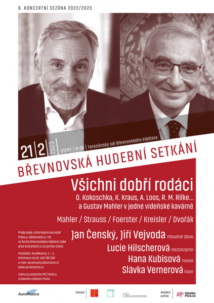 Pořadatelé Břevnovských hudebních setkání zahajují řadu letošních devíti koncertů. První koncert bude netradiční, hlavní roli v něm představuje mluvené slovo, samozřejmě doprovázené hudbou. Jan Kolář a Jiří Vejvoda vytvořili mozaiku příběhů umělců s českými kořeny žijících ve Vídni. Potkávají se ve fiktivní vídeňské kavárně v roce 1911. A mihne se v ní i odmítnutý adept studia malířství na vídeňské akademii s ulízanou patkou a typickým knírkem pod nosem. Akce se bude konat v Tereziánském sále Břevnovského kláštera v úterý 21. února od sedmé hodiny večerní.