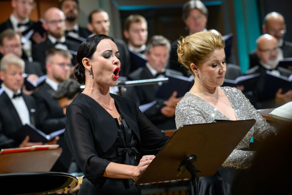 V poslední době mimořádně vytížená sopranistka Kateřina Kněžíková přednesla svůj part s čítankovou dechovou oporou, hlas se hezky nesl prostorem, deklamace byla přesná a její soprán tvořil krásný kontrast k mohutnému sboru. Její výkon však působil poněkud rezervovaně, s menší expresivitou. Ruská altistka Anna Gorjačova měla k textu nejblíže a také projevovala, že je s dílem velmi sžita, ale bohužel téměř nebyla slyšet, a problém prosadit se měli ze začátku i oba pánové: ukrajinský tenorista Denys Pivnickij i slovinský basista Domen Križaj, nicméně později předvedli své pěkné a zdravě vedené hlasy s excelentní dynamikou, včetně předepsaných dynamických výkřiků, kdy jim zdatně sekundoval Lukáš Hynek-Krämer ze sboru. Všichni sólisté byli však až příliš fixováni na noty, kontakt s publikem byl minimální, byť musím jedním dechem dodat, že technická náročnost díla je opravdu mimořádná, a tak jejich ponor do not vlastně celkem chápu.