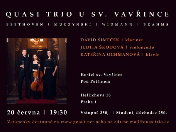Quasi Trio hrající ve složení David Šimeček (klarinet), Judita Škodová (violoncello) a Kateřina Ochmanová (klavír) zahraje na konci koncertní sezóny v kostele svatého Vavřince na Malé Straně v Praze. Koncert se koná v úterý 20. června.