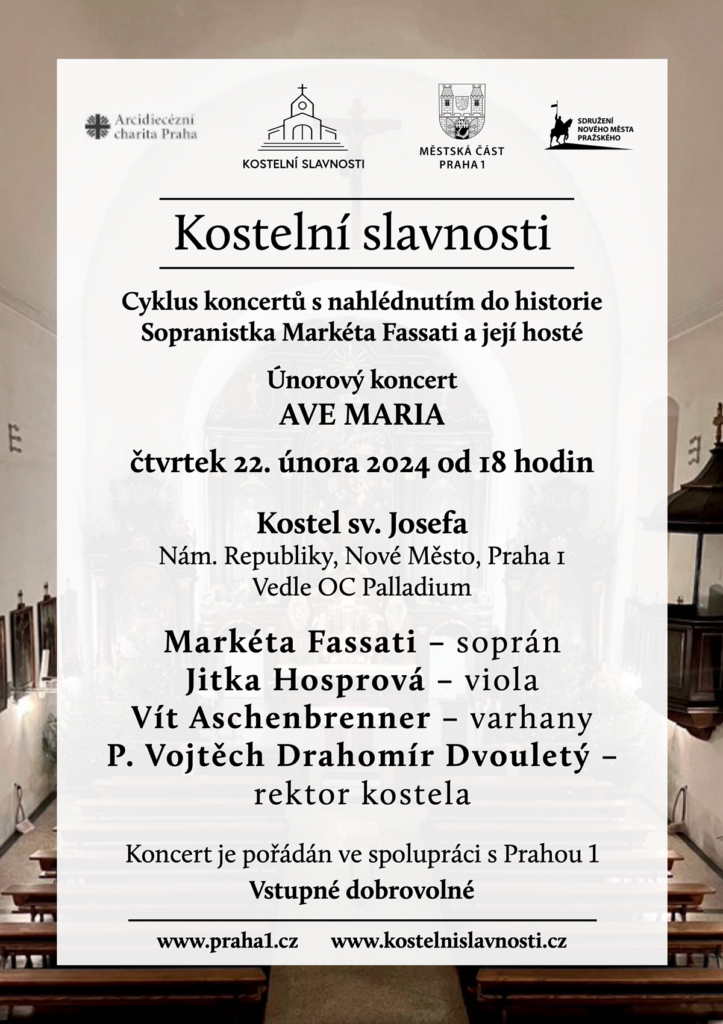 Cyklus koncertů s nahlédnutím do historie, který pořádá sopranistka Markéta Fassati ve spolupráci s Městskou částí Praha 1, bude pokračovat ve čtvrtek 22. února v kostele sv. Josefa na Novém Městě. Večer s titulem Ave Maria nabídne převážně rozličná hudební zpracování jedné ze základních modliteb katolické církve oslavující Pannu Marii. Hosty Markéty Fassati budou violistka Jitka Hosprová a varhaník Vít Aschenbrenner. O mimohudební přesah setkání se postará P. Vojtěch Drahomír Dvouletý, rektor svatojosefského kostela.