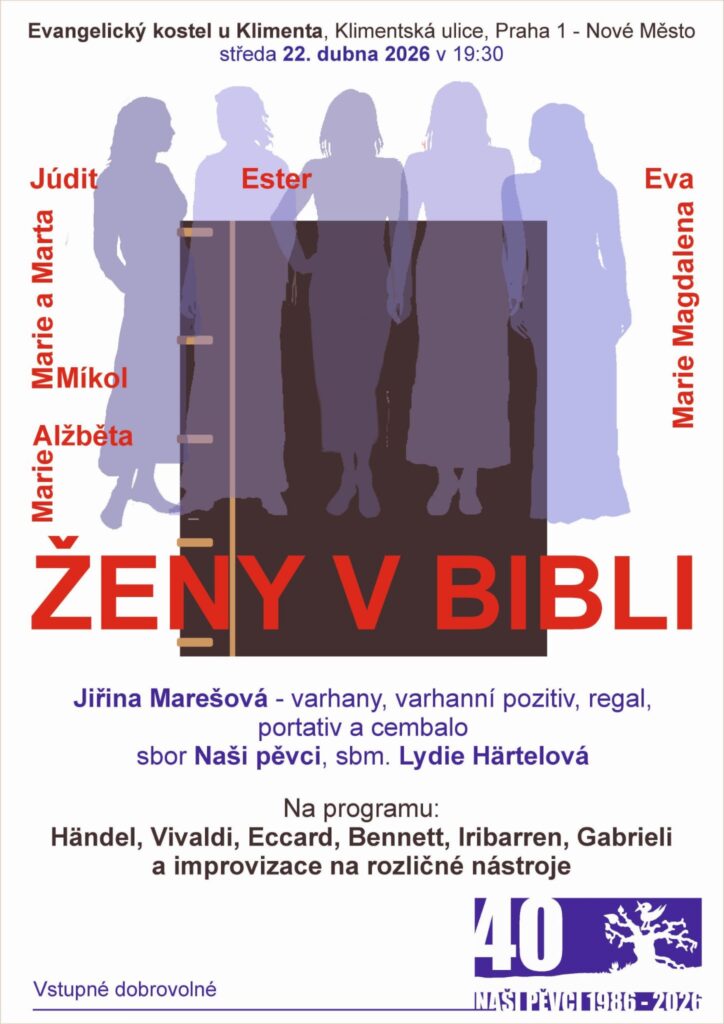 Koncert se uskuteční v prostoru evangelického kostela sv. Klimenta na pražském Novém Městě a dramaturgicky se zaměří na biblické motivy ženských postav. Vedle sboru Naši pěvci vystoupí varhanice Jiřina Marešová, která se představí nejen hrou na varhany, ale také na další historické klávesové nástroje včetně varhanního pozitivu, regalu, portativu či cembala. Součástí večera budou i improvizace, které doplní interpretovaný vokální repertoár. Program koncertu zahrnuje díla skladatelů, jako jsou Georg Friedrich Händel, Antonio Vivaldi, Johannes Eccard, Richard Rodney Bennett, Juan Francés de Iribarren a Giovanni Gabrieli. Dramaturgie tak propojuje renesanční a barokní hudbu s mladšími skladbami i současnou interpretační praxí.