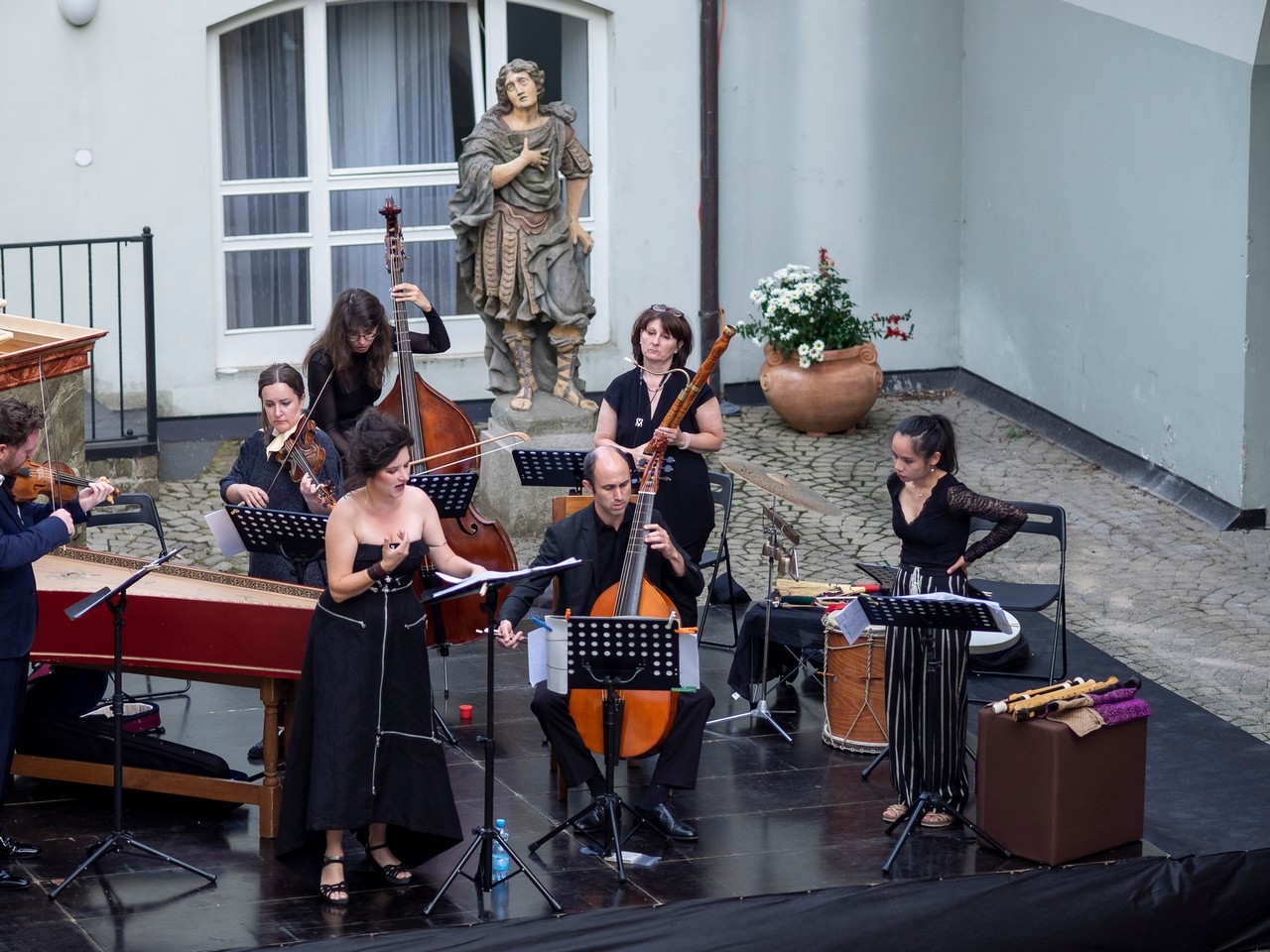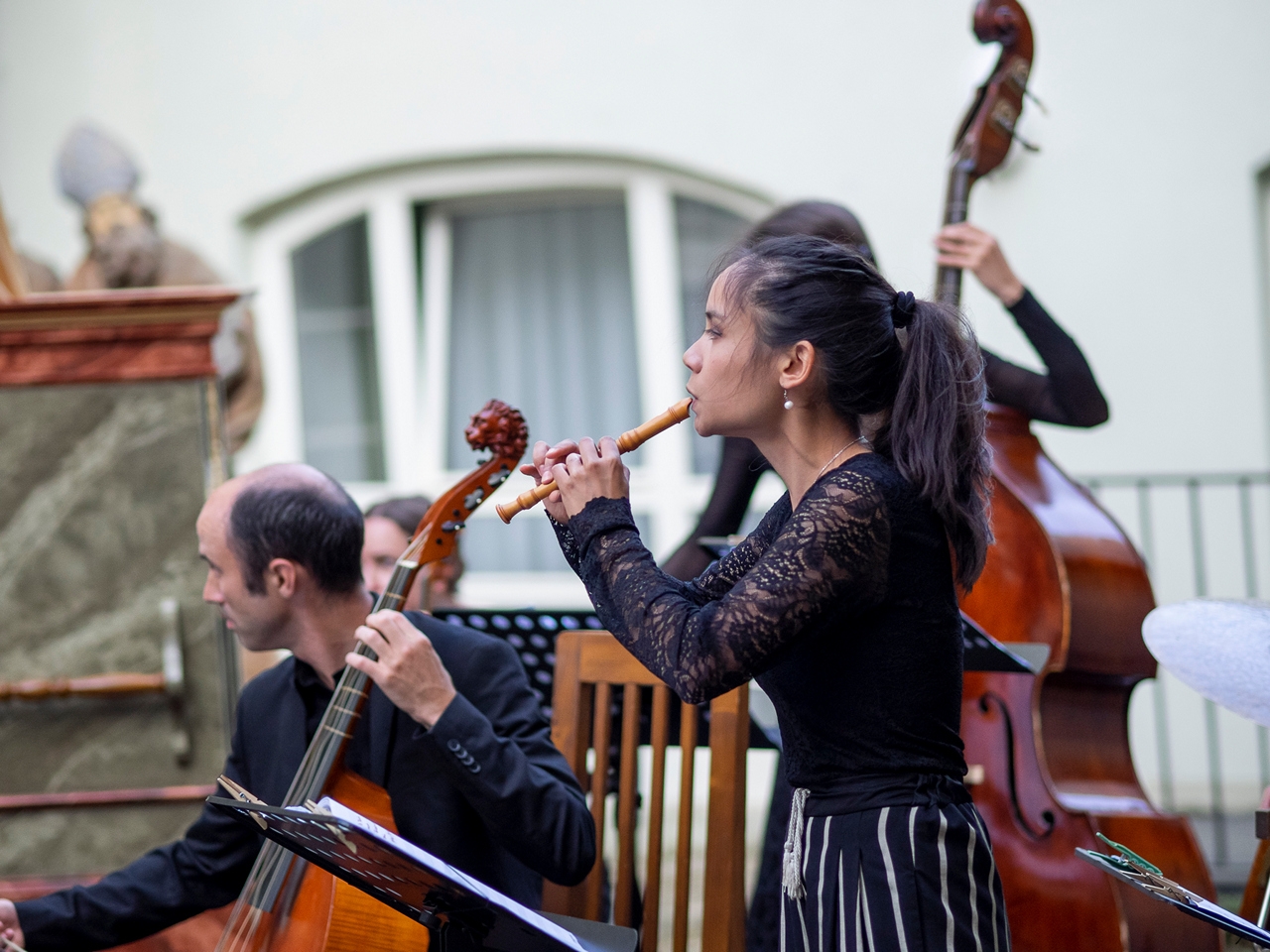 Slyšeli jsme komorní soubor využívající zvuk dobových nástrojů k zajímavým kombinacím, k sugestivnímu podmalování zpěvu, ke kontrapunktům a krátkým mezihrám. Největší pozornost přitahovala Manuela Maria Mitterer s několika zobcovými flétnami, ovládanými s naprostou samozřejmou virtuozitou a s grácií; reagovala na sólistku i na kolegy, doplňovala, dotvářela a zdobila, měla v zásobě nepřeberné množství artikulačních a výrazových detailů. Je to muzikantka se širším zázemím dosahujícím i k alternativě, hrající starou hudbu neodolatelně tvůrčím způsobem. Umělecký vedoucí souboru Robin Peter Müller vedl zcela nápadně, vlastně to ani nebylo potřeba, šlo o samostatně tvořící hudebníky, podobně jako v jazzu. Logicky vystupoval v některých okamžicích do popředí i perkusionista Peter A. Bauer.