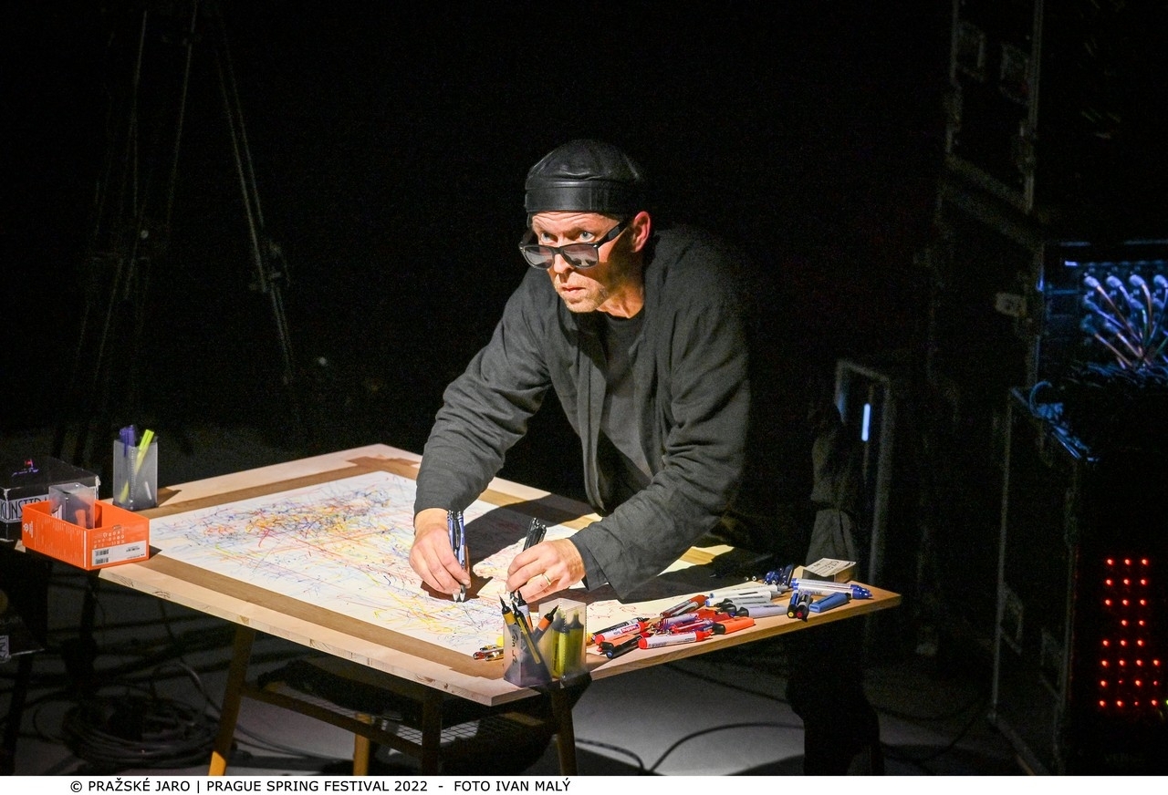 Do druhého koncertu Klangfora Wien byla ještě vsunuta výše zmíněná konceptuální kompozice architekta Petra Hájka, který měl v podvečer v Auditoriu zajímavou přednášku o komponované architektuře. Akci performerů na balkoně jsme sledovali na plátně v sále a jedna kamera snímala ještě simultánní akci Josefa Duchana, který byl přímo v sále a vytvářel na hudbu automatickou kresbu.